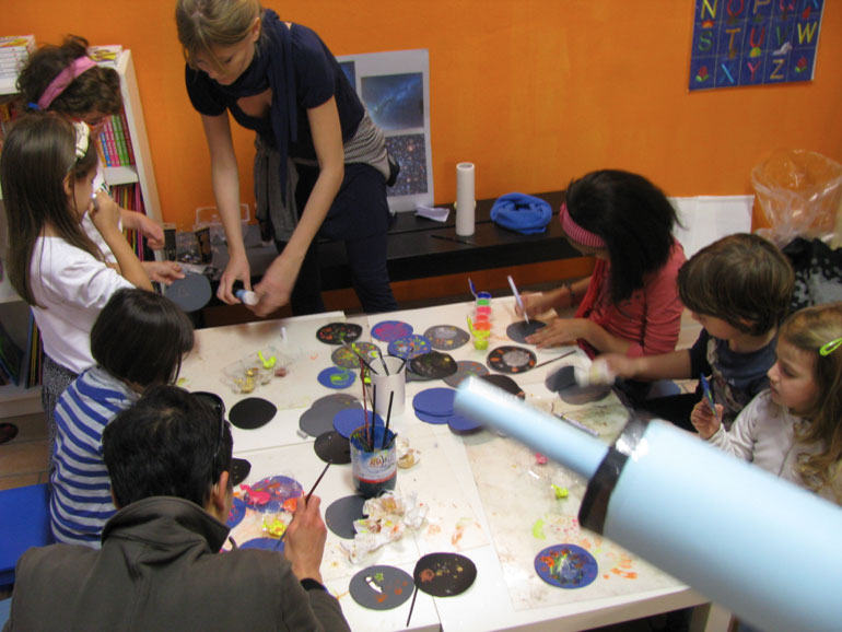 Nelle immagini, uno scorcio dellalibreria Matilda, Cecilia insieme ai bambini e i meravigliosi corpicelesti creati durante il laboratorio.